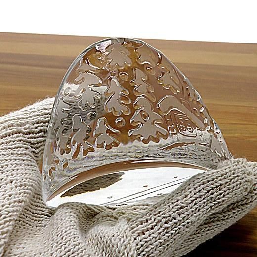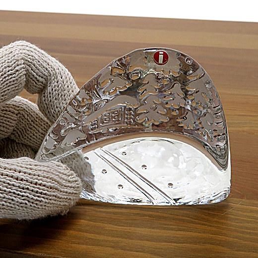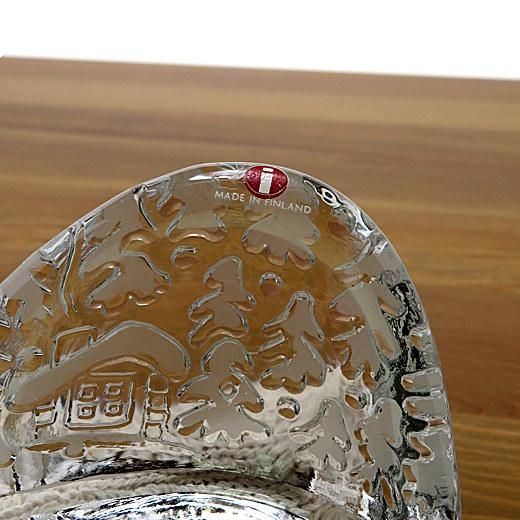 摺りガラス加工によって屋根やモミの木に雪が積もったように見えるのが素敵です。また、底面にはシュプールとストック跡つけられていて奥行きを感じる秀逸なデザイン。イッタラ社の古い時期のシールが綺麗な状態で残っているのも魅力です。