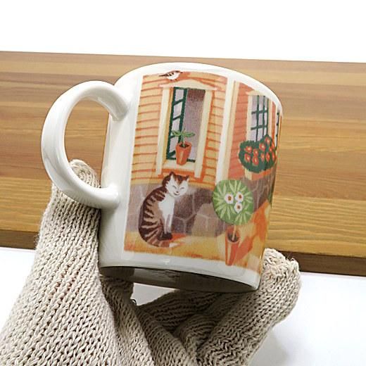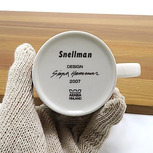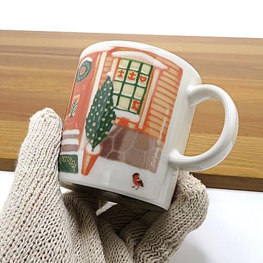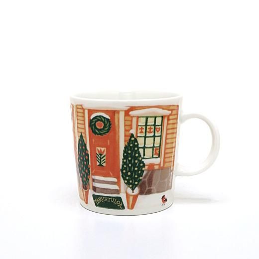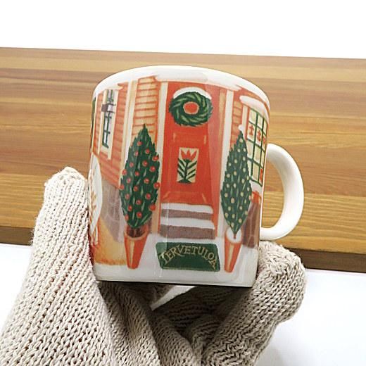 フィンランドの大手食肉加工メーカーSnellman(スネルマン)のノベルティマグ。リースが飾られたドアやオーナメントがつけられた植木がクリスマスらしいデザイン。エプロンをした男性は同社のロゴにも起用されている創業者のスネルマン氏。小鳥や猫もいるフィンランドらしい街の風景が可愛いです。